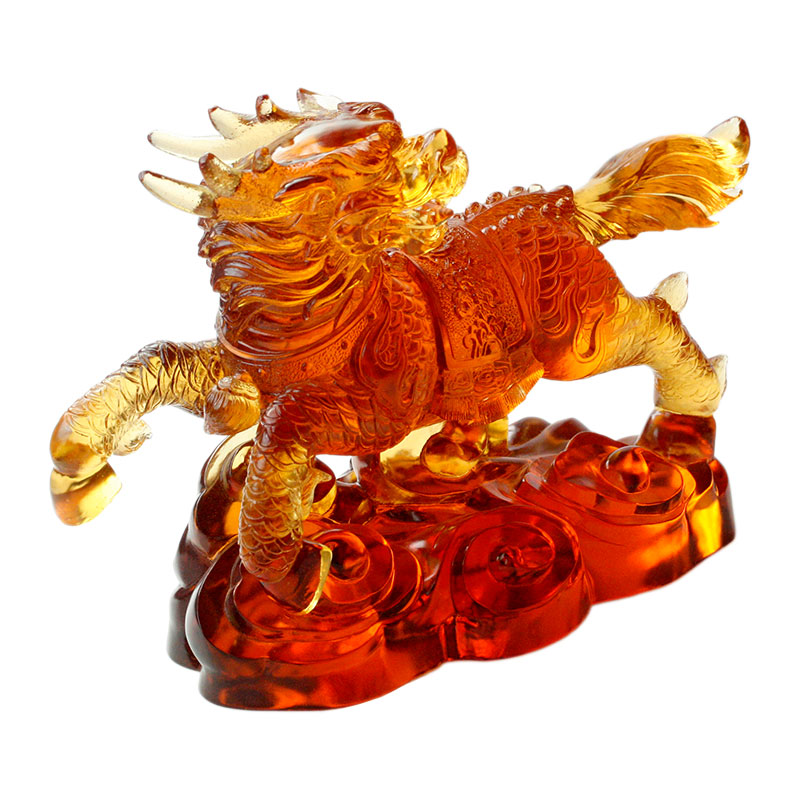 Tá cruth an bheathach ghloine seo, agus léirítear gach mionsonra go han-mhín, ó léiriú aghaidhe an ainmhí go línte matán an choirp, agus go staidiúir galánta an eireaball, agus léiríonn siad seo go léir sárscileanna an cheardaí. Glacann an beithíoch gloine seo ton te agus cisealach. Tugann an dath ómra meon maorga agus sollúnta dó, amhail is gur beithíoch caomhnóra é ó sheanscéal. Déanfaidh an ghloine solas a fheictear a athraonadh faoi soilsiú an tsolais, rud a fhágann go mbeidh éifeachtaí amhairc éagsúla i láthair ag an ainmhí gloine seo ag uillinneacha éagsúla, ag cur lena charm mistéireach.