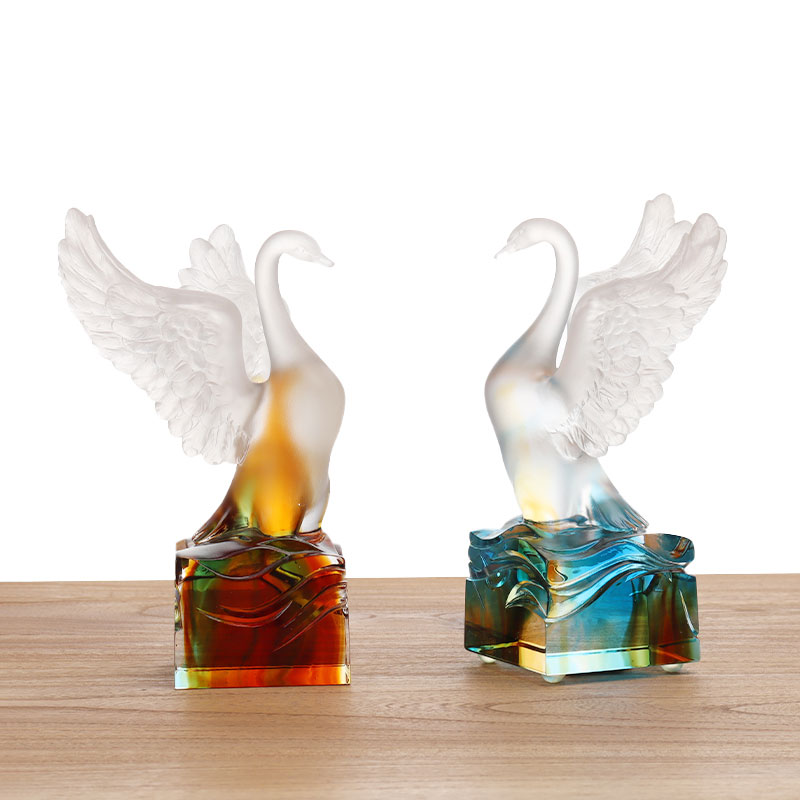 Léiríonn an eala ghloine seo na tréithe gloine seo go inmhianaithe. Tá staidiúir galánta ag an eala, agus a sciatháin scaipthe amach, amhail is go bhfuil sé ar tí eitilt ard. Tá gach cleite snoite go cúramach agus go cúramach, ag taispeáint áilleacht éadrom agus lúfar.