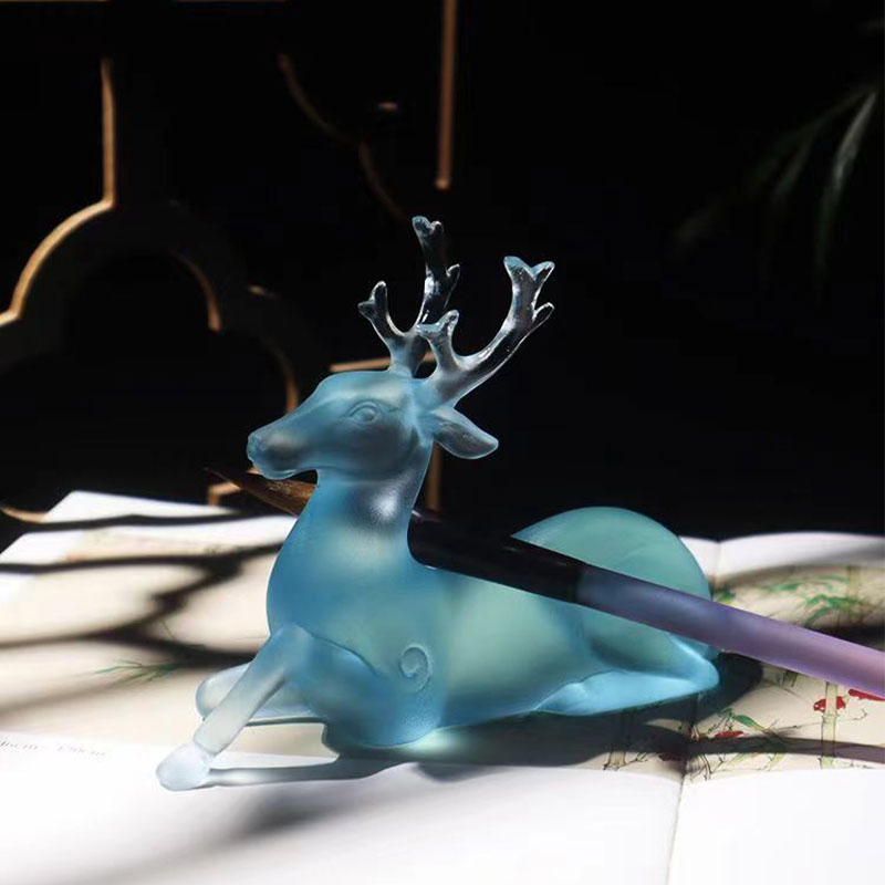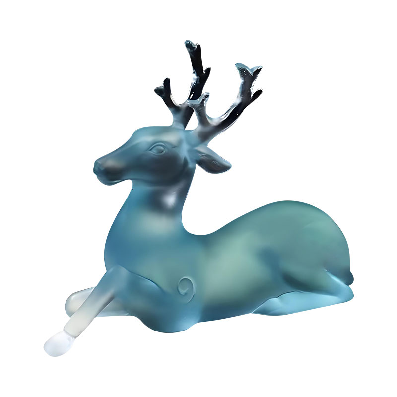 Is saothar meisciúil ealaíne é an sealbhóir scuab fianna gloine Gorm seo. Úsáideann an táirge ton úr gorm-uaine, rud a thugann mothú suaimhneas agus elegance do dhaoine, amhail is dá mba rud é go soladaíonn sé aclaíocht agus suaimhneas an dúlra. Is íomhá fianna é an sealbhóir scuab gloine Gorm seo, le staidiúir galánta agus línte mín. Tá beanna na fianna íogair agus fíorálainn, tá cuair an choirp nádúrtha agus bog, agus léirítear gach mionsonra go mion, ag taispeáint sárscileanna an cheardaí. Déanann uigeacht na gloine cuma saolta ar na fianna, amhail is dá léimfidh sé go héadrom sa chéad soicind eile.