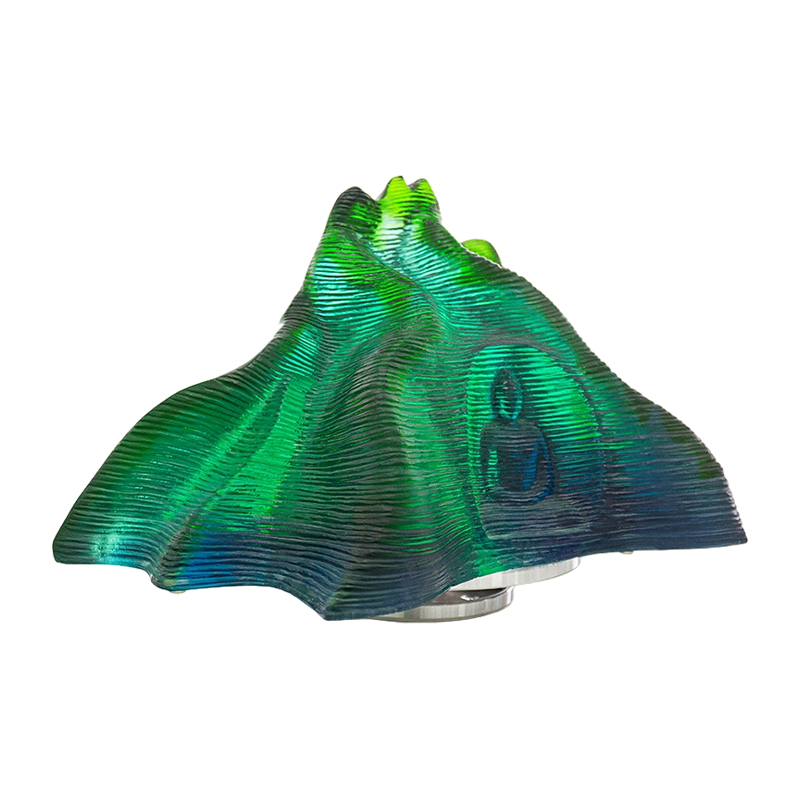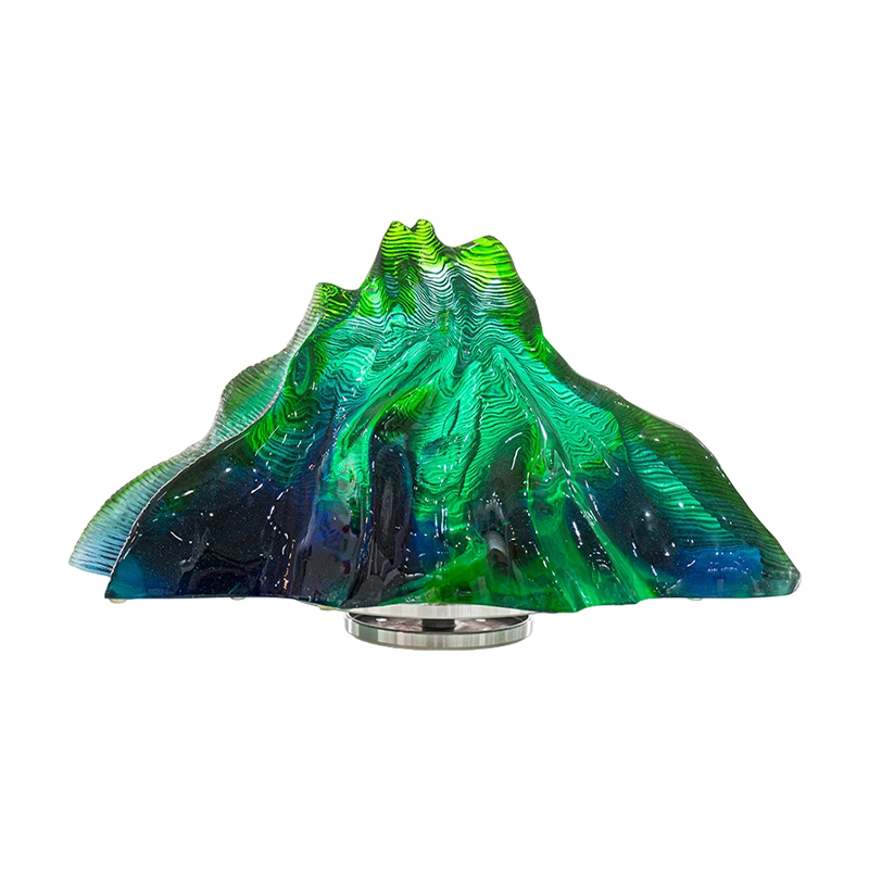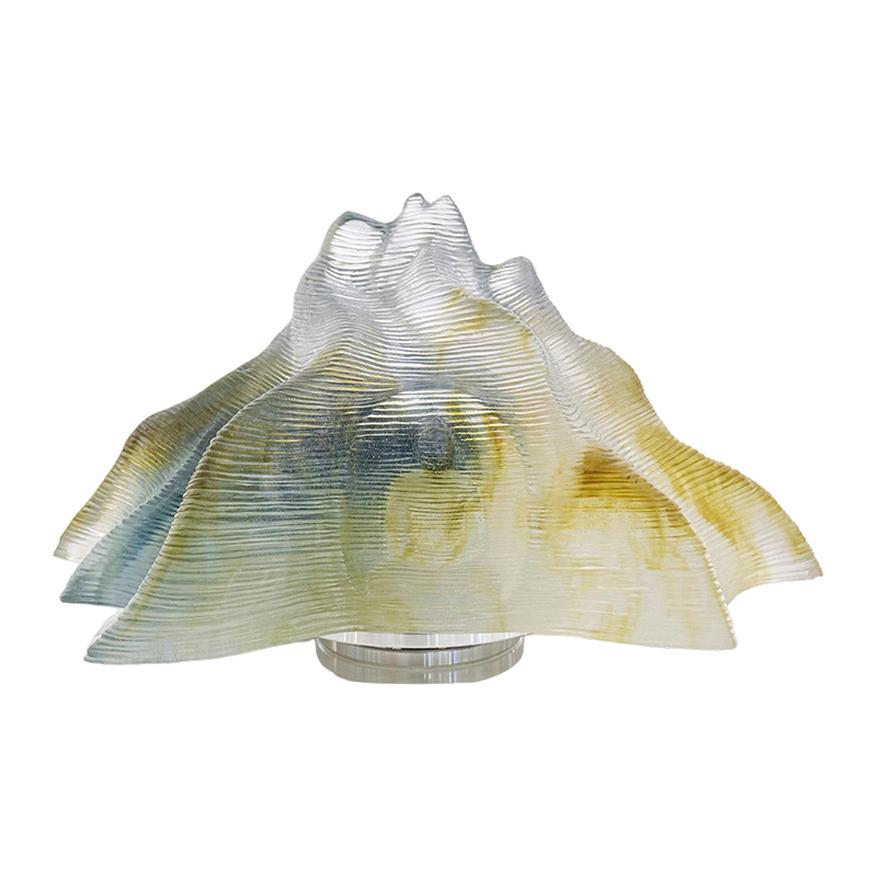 Léiríonn na fillteáin sléibhe laistigh den phíosa uigeacht gheolaíoch an tsíonchaitheamh nádúrtha agus rianta siséalacha na snoíodóirí cloiche a ‘d’úsáid siséil mar scuaba.’ Athraíonn sé seo an cheardaíocht phríomha ‘sléibhte snoíodóireachta ina Búdaigh’ go deireadh rithimeach na faoisimh ghloine criostail lámhsnoite.