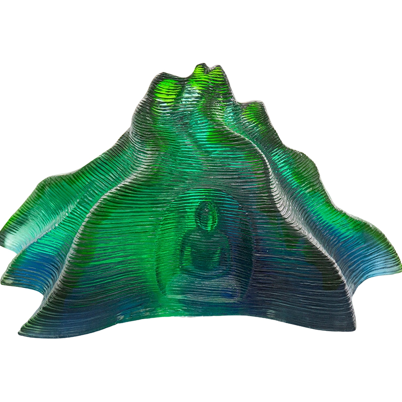 Feidhmíonn trédhearcacht, grádáin datha, agus idirghníomhú an tsolais agus an scátha i ngloine chriostail mar ‘mheán Zen’ idirlinne san am a chuaigh thart agus san am i láthair. Tarraingíonn an grádán ó verdant glas go gorm domhain inspioráid ó na foraoisí lush agus ciarsúr suaimhneach an tSléibhe Anyue, resonry le híomhánna de traidisiúnta Síneach 'phéinteáil gorm-uaine tírdhreacha' - ag baint úsáide as dathanna an dúlra chun an teampall uaimh a nascadh le rithimí neamh agus talamh. De réir mar a théann solas tríd an ghloine sraitheach, fite fuaite le meascán dathanna agus seachmaill, rud a thaispeánann éirim soineanta ceo breac an lae ag clúdach na bpluaiseanna. Léirmhíníonn cómhaireachtáil chanúinteach ‘folamh’ (caighdeán tréshoilseach) agus “dath” (tonnta fionnuara glas-gorm) léargas fealsúnach deiridh an Bhúdachais: ‘Folús is foirm, foirm is folúntas.’ De réir mar a shreabhann an solas agus an scáth trasna dromchlaí cuartha, bíonn na foirmeacha sléibhe agus scáthchruthanna Búda ag aistriú go leanúnach ar an toirt, agus an dealbhóireacht shíoraí ag athrú go buan ag an dealbhóireacht shíoraí. suaimhneas driogtha ag millennia gaoithe agus báistí ar shnoíodóireacht cloiche Anyue.