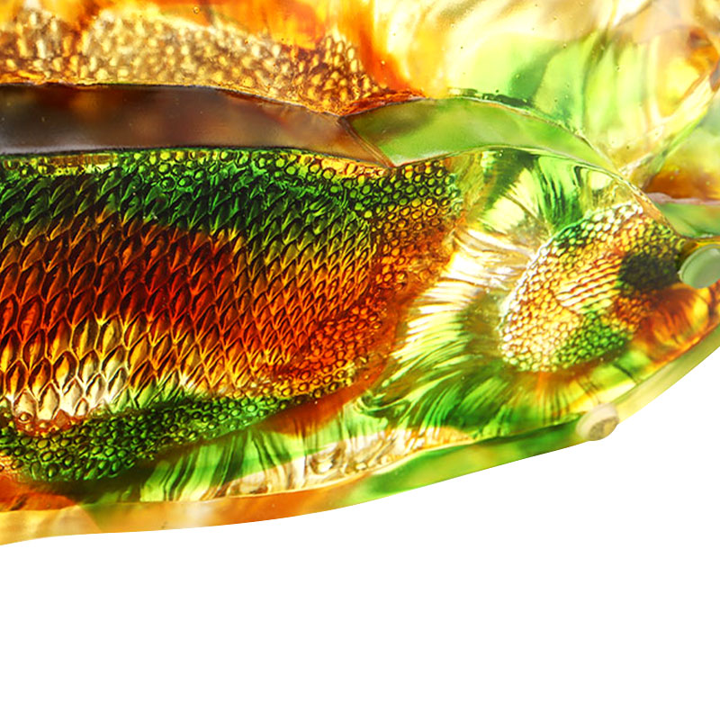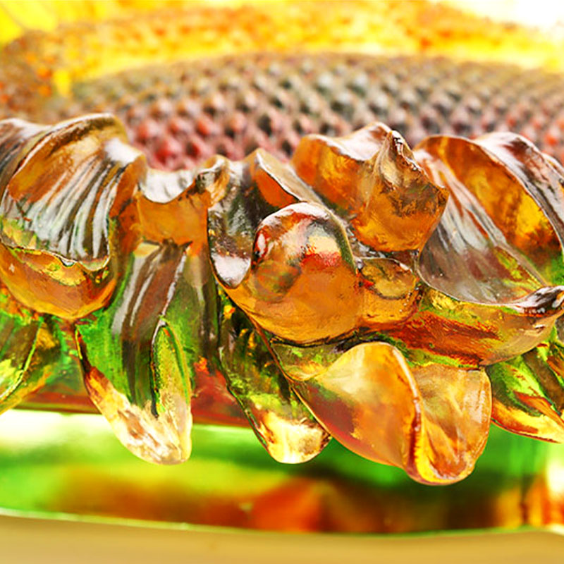 Is cosúil go bhfuil an pláta daite aghaidh na gréine glaze comhdhlúite ag solas na gréine. Tá gach líne ar an pláta cosúil leis na lorganna a d’fhág solas na gréine ar na peitil, ag lonrú le solas órga. Déanann an cheardaíocht fíorálainn beogacht agus fuinneamh na lus na gréine a shocrú go síoraí sa ghlónra daite. Tá na torthaí dearga ar an pláta chomh geal le lasracha, ag cur dath bríomhar leis an bpláta gréine fíorálainn seo. Ní hamháin gur saothar ealaíne é, ach freisin meascán inmhianaithe de sholas na gréine agus den saol. Is féidir leis teas agus áthas a scaoileadh nuair a chuirtear ann go ciúin é.