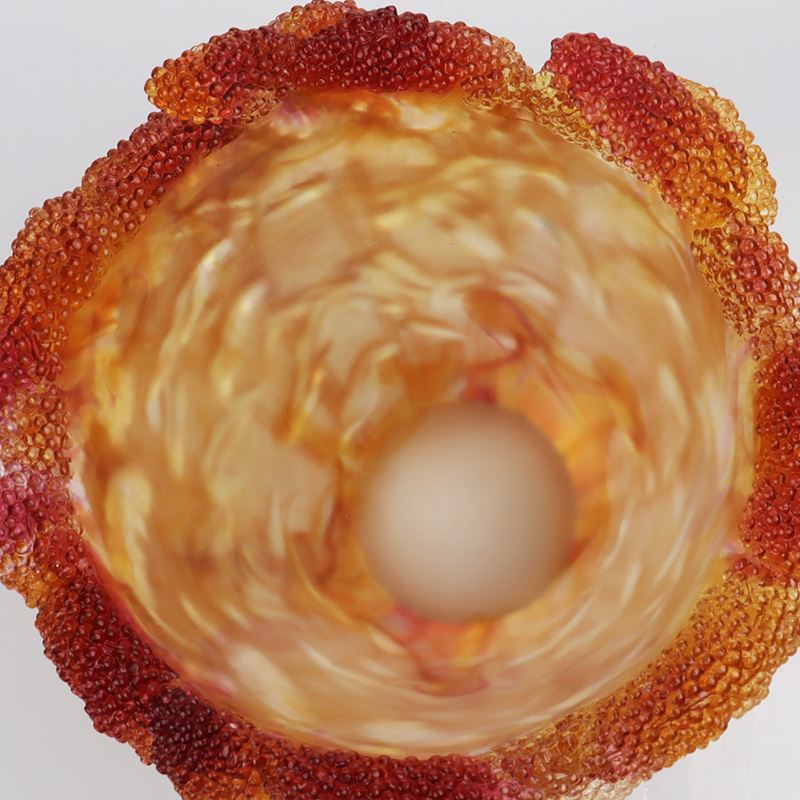 Le linn teilgin céir caillte, fiúsann agus téann líocha ag teochtaí arda, rud a fhágfaidh grádáin ó dheighilt mheicniúil. Is imbhuailtí suaracha idir na heilimintí copair agus an mhaitrís gloine laistigh den áith míle céim iad na halos ómra-hueded ina dtagann an óir agus an dearg le chéile - ag déanamh aithrise go foirfe ar nochtadh na gréine míchothrom a thugann a n-uigeacht bharántúil do bharra. Cuireann an “chaos rialaithe” seo beogacht nádúrtha isteach sa cheardaíocht shaorga—cosúil le sorghum a mhairfidh an ghaoth agus an bháisteach, a thuirlingíonn sa ghrian, agus a fhorbraíonn ar deireadh thiar a dathanna bríomhara sna páirceanna oscailte.